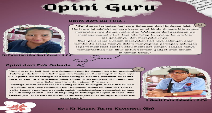 Nah, ini adalah mading dari segmen Opini Guru. Segmen ini menjabarkan opini tentang hari raya Galungan & Kuningan dari beberapa guru kami.